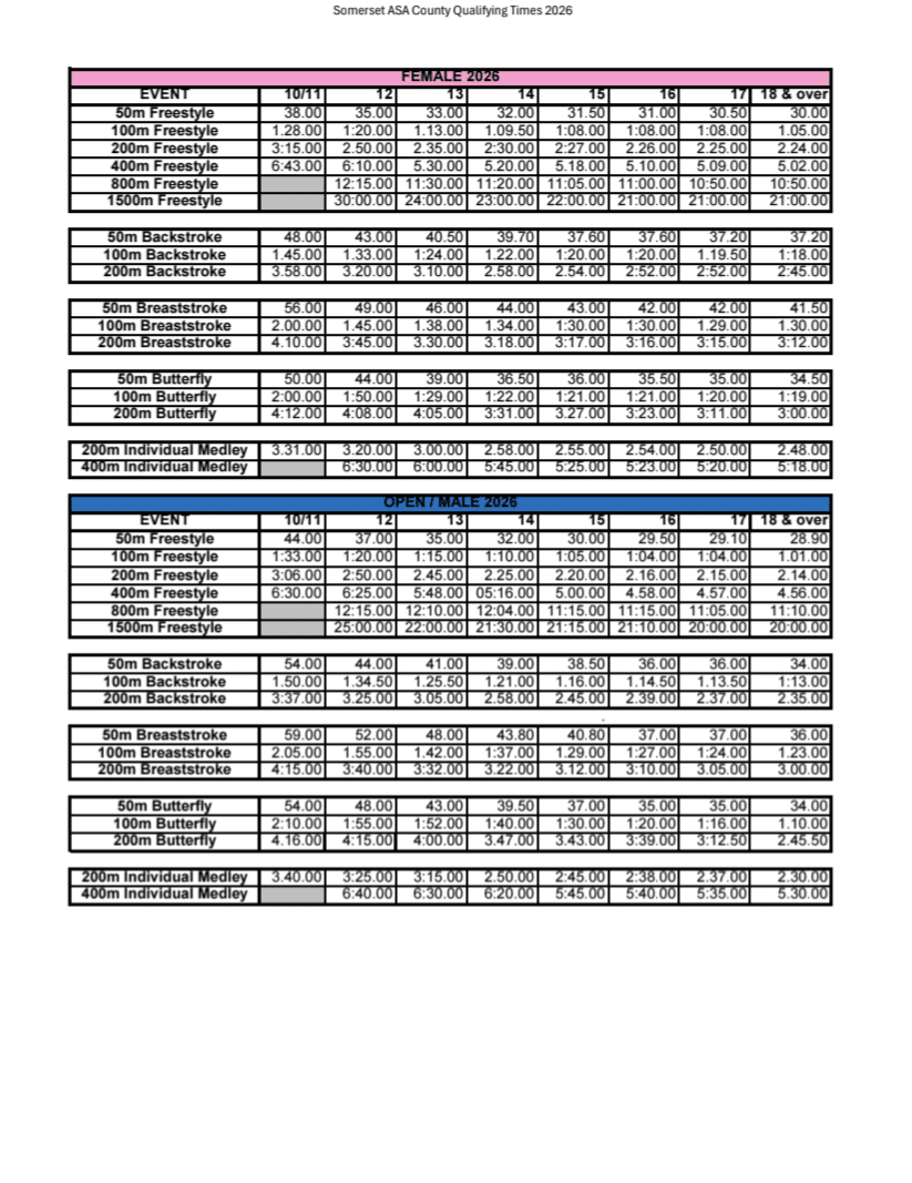 Somerset ASA County Qualifying Times 2026