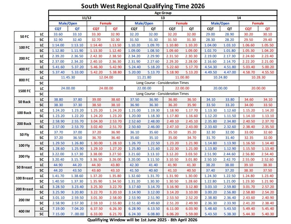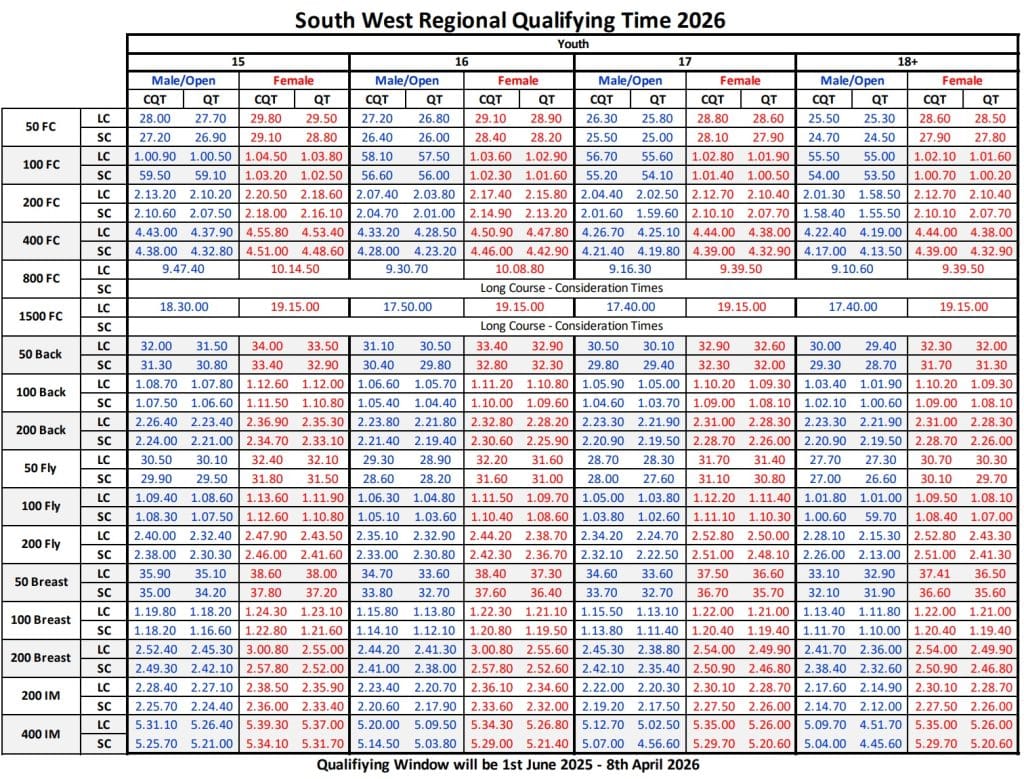 These times are updated each year and we will update them once they are received. For more information please visit the Swim England South West website https://www.swimwest.org.uk/